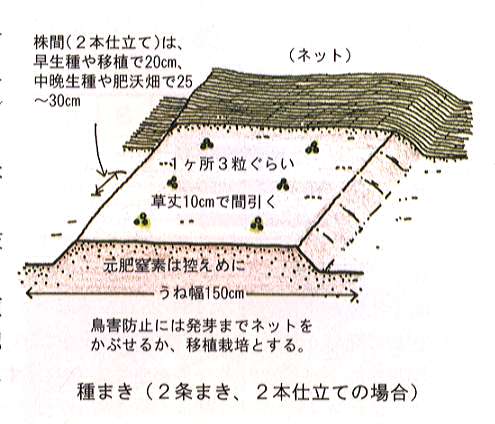直まきでは深さ3cm、1カ所2〜3粒の点まきとします。株間は1本仕立ては17〜20cm、2本仕立てでは20〜30cmで、早生種は狭く、中・晩生種や肥沃なところでは広くします。