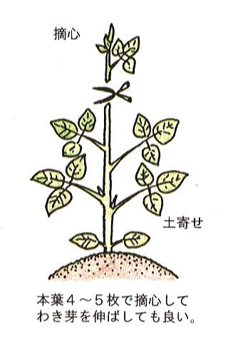 6月上〜中旬、ポリポットにタネまきし、本葉が見えだした頃、株間30cmの1条植えにします。7月中旬には双葉の下まで、7月下旬には初生葉が隠れる程度に土寄せします。 側枝に莢をたくさんつけるために、2回目の土寄せのとき(本葉5〜6枚のとき)摘心します。施肥はエダマメに準じてください。10月上旬から収穫できます。