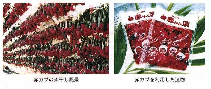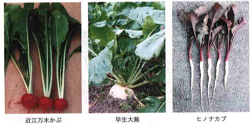 白の小カブ、大カブ、地方色豊かな多数の色カブがあります。本県産では、日野菜と万木(ゆるぎ)カブが代表的な色カブで、園芸店で購入できます。特に、万木カブは根こぶ病に強い性質をもった新しい品種が県農業試験場で育成され、「近江万木カブ」として市販されています。また、矢島カブ(守山)、小泉カブ(彦根)、赤丸カブ(米原)は、今でも地元で自家採種され、昔ながらの形・色・味が受け継がれています。