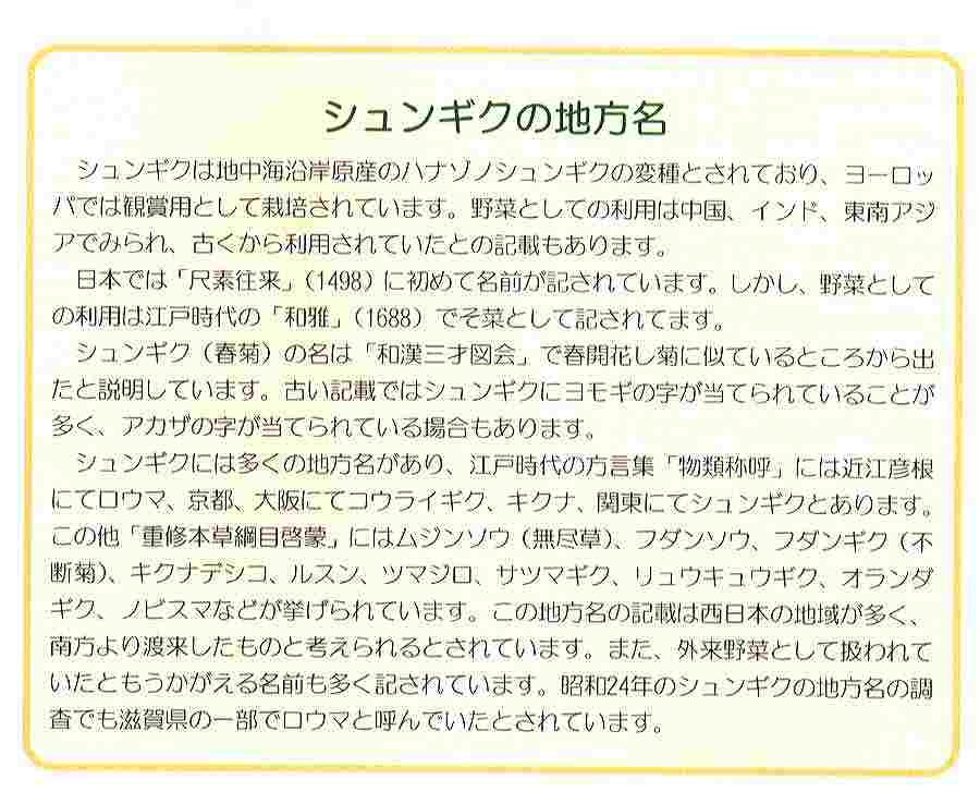 春まきは4月上旬に、秋まきは9〜10月には種します。種子には発芽抑制物質が含まれていますので、流水に一晩漬けておきます。シュンギクの種子は発芽に光を必要としますので、覆土はできるだけ薄くなるようにていねいに行います。覆土を薄くするため覆土してからかん水すると種子が洗われて出てきますので、かん水してから覆土を行うと良いでしょう。直まきは条間20cmの2条まきにします。