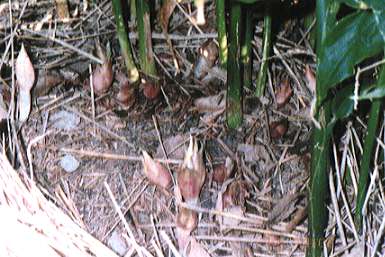 追肥後、うね全面にわらを厚く敷きます。薄いとミョウガ独特の紅色が出にくくなります。梅雨期は排水を良くし、梅雨明け後は、乾燥させないように水をやります。植えつけ2年目以降は株が増えてきますので、5〜6葉期頃、1u当たり50〜60本に間引きます。間引いた株は別のところに植え替えることができます。