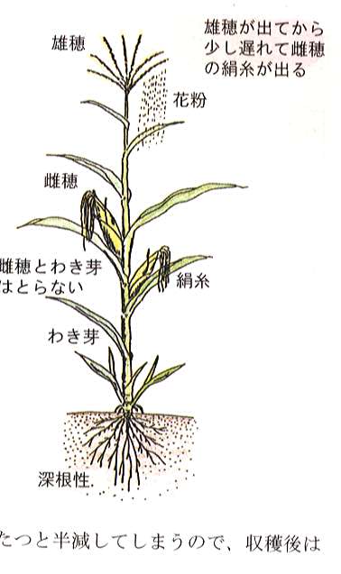 くなるよう、わき芽はとりません。また、雌穂(収穫する部分)も、そのままにしておきます。しかし、混み合って活動葉が陰になる場合は、中間で切り落とします。