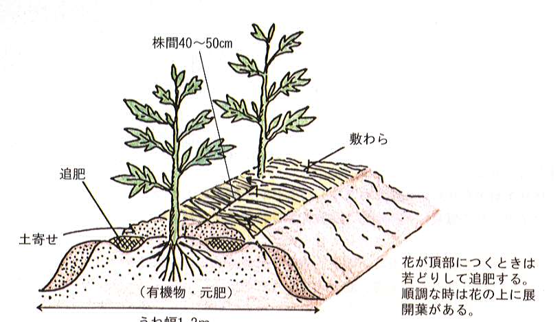 畑の準備 土の保水性・排水性を高め、根張りを良くするために堆肥等の有機物を十分に施し深耕します。1u当り堆肥2〜3kg、苦土石灰100gを施用し荒起しします。4〜5日後に高度化成100gを施し、耕耘して1.2m幅の畝を立てます。排水の良くない所では、高うねにします。