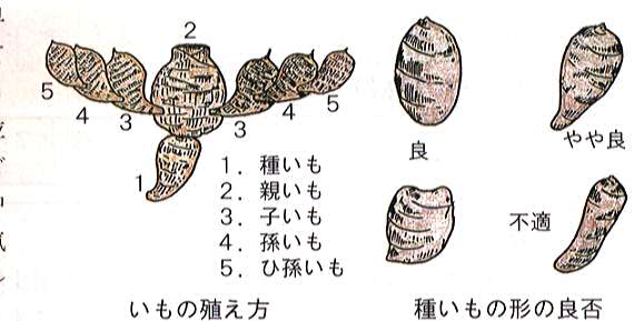 種イモは子イモか孫イモを使い、前年のイモを自家貯蔵しておくか購入します。大きい種イモほど初期生育が早いので、最低でも40g以上のふっくらした丸形で、芽の傷んでいないものを使います。八ツ頭は親イモを使ってもよく、そのままか3〜4片に分割します。4月中〜下旬に株間30〜40cmの1条植えとします。子イモ用品種は株間を狭く、兼用種では広くします。植えつけは、