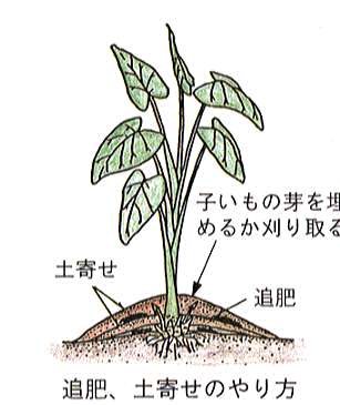 乾燥に弱いので敷きわらとかん水で土の水分を保つ。 大きいイモを植え、土寄せをして良質のイモを作る。 連作をさける。