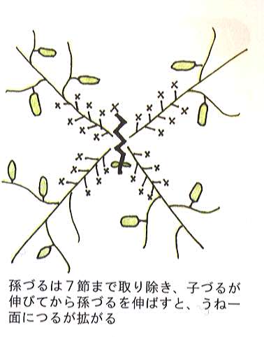 シロウリもトウガンも共に孫づるに着果します。親づるは5〜6節で摘心し、勢いのよい子づる4〜5本を伸ばします。四方に広がるように配置します。子づるの下位7節までの孫づるは取り除き、後は放任にします。整枝が遅れると、子づる、孫づるの区別がつかなくなり、何節目から出ているのかも分からななってしまいます。