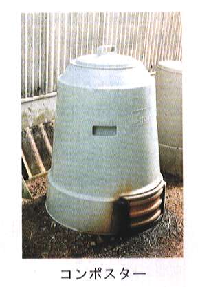 台所から出る生ゴミを畑に戻してやることは、ゴミ問題を解決する上でも重要です。生ゴミから堆肥を作る方法としては、コンポスター(写真)を設置する方法が一般的です。生ゴミは、ビニールなど腐らないものを取り除いてよく水を切ります。これをコンポスターの中に投入していくだけですが、時々米ぬかや落ち葉、刈り草などを加えてやると良い堆肥ができます。ある程度一杯になったら、コンポスターを移動し、出てきた堆肥にはビニールをかぶせて雨をよけ、さらに発酵させます。この生ゴミ堆肥はまだ半熟な場合が多いので、は種や定植の1カ月くらい前に、うねの中央に溝を掘って、底に埋めて利用するのが安全です。