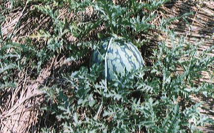株間1mで定植します。スイカは根の再生力の弱い野菜なので、できるだけ根鉢をくずさないように注意して定植します。定植後は十分にかん水してホットキャップをかぶせます。直まきの場合は4月下旬に1晩水につけた種子を、1ヶ所に3粒ずつまき、ホットキャップで密閉し発芽させます。本葉2枚になったら1本にします。