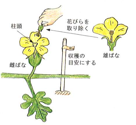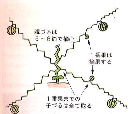 本葉6〜7枚で、生育のよい子づるを4本伸ばし、つるが重ならないように配置します。1番果の着果節位までの孫づるは全てかき取り、その後は放任します。つるはうねの肩から落ちないように誘引します。