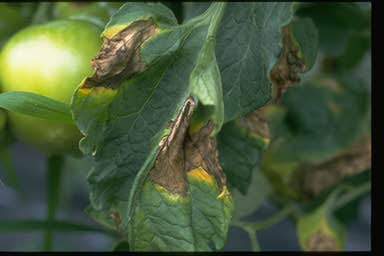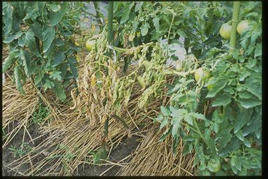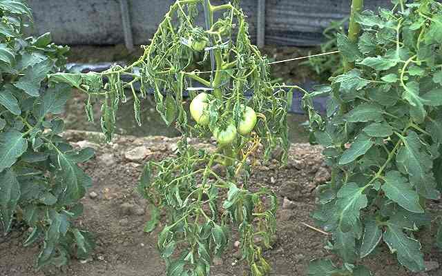 梅雨時に疫病が多発します。見つけ次第発病小葉をこまめに摘み取ることで、被害を軽くすることができます。ジマンダイセン<ペンコゼブ>(収穫前日、2回まで)で防除します。収穫期に株が急にしおれ、数日間で枯死するのは青枯病です。株ごと抜き取って処分しましょう。翌年はナス科作物(ナス、ピーマン等)の植え付けを見合わせます。