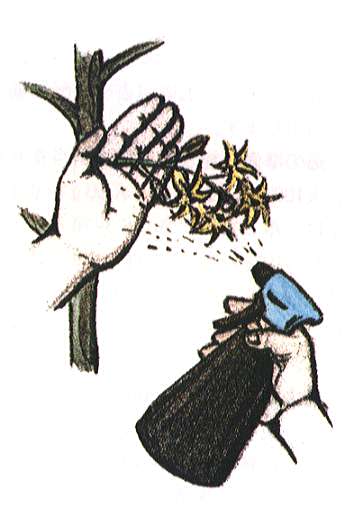 第1花房の着果を確実にするためにホルモン剤の処理をします。トマトトーンの50倍から100倍液を、花房当たり2〜3花開花した時にかけます。花房を手のひらで挟み、生長点に液がかからないようにして1回噴霧し、滴を払います。生長点にかかると生育異常が起こりますし、2回、3回かけると空洞果ができます。第2花房以上については、ホルモン処理を行わなくても自然着果します。