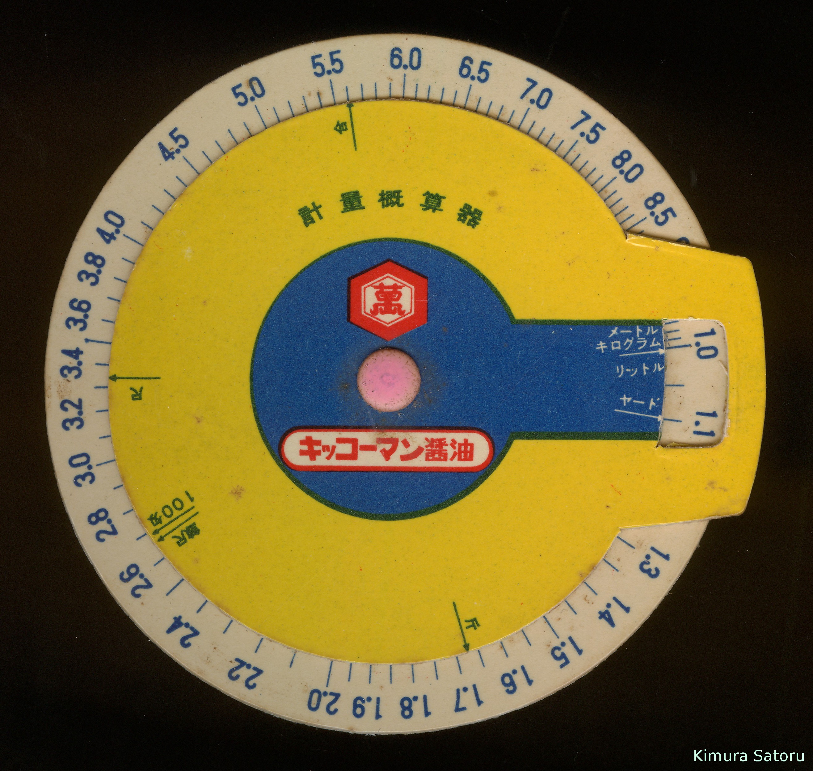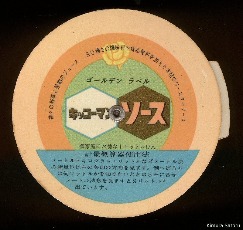 キッコーマンのノベリティ物になるでしょう「計量概算器」です。もちろんキッコーマン醤油の消費増を狙う物でしょう。 自分で概算と言い切るところはなかなか潔い態度です。 元来料理用なんでしょうから、数%なんて十分誤差のうち。概算で結構って事でしょう。 外周の目盛りは対数目盛で、内円側には目盛りの代わりにゲージマークのみ書かれています。 さて、肝心の精度ですが、概算といいながらもほぼ正確です。余分の醤油を入れる心配はありません。