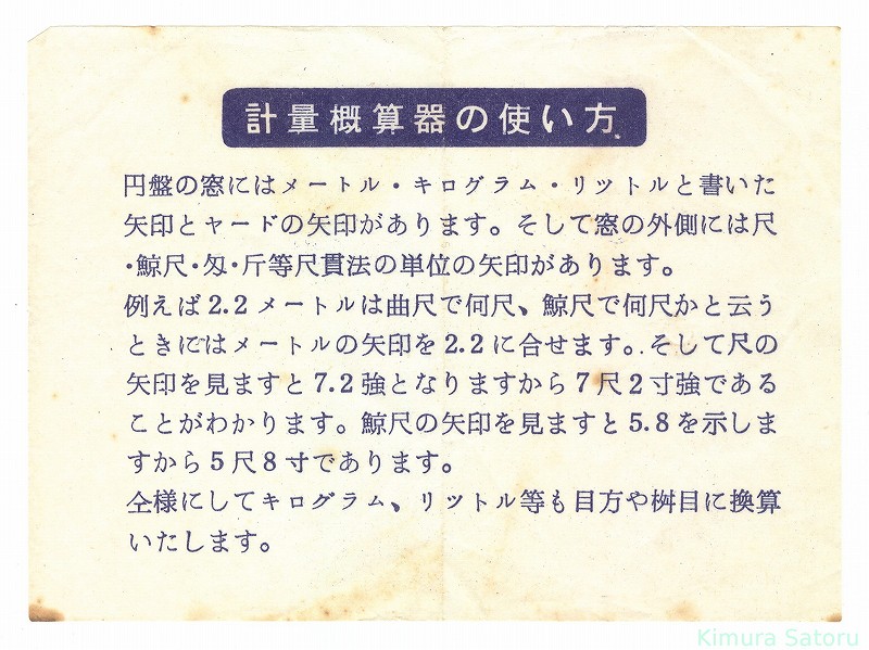 表面 C尺相当の1周期尺 [ メートル/キログラム/リットル , ヤード , 斤 , 鯨尺 , 100匁 , 尺 , 合 (ゲージマーク) ] ※ [ ] 内は滑尺