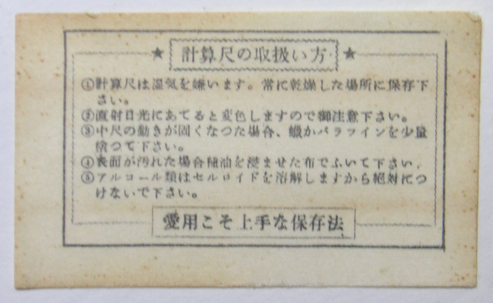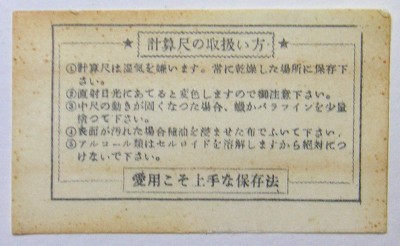 何が目を引くと言って「\150」てっところが一番目を引きますね。いわゆる学生用として作られた物のうちの一つだと思われます。 尺の末端が微妙に合わなかったり、印字が薄かったり、裏面が使われていなかったりと多少雑な面が見受けられます。 でもこれで当時価格(おそらく昭和30年代の終わり)で\150なら及第点じゃないかなぁ。
